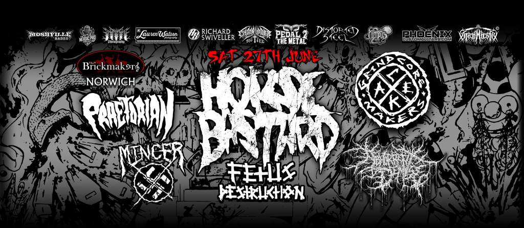 HorseBastard bring original grindcore with one of the scenes best blastbeats. The grindcore cake makers promise to clean up afterwards. Praetorian with unintelligable screeching to doom/sludge. Mincer bring the brickmakers debut of their new singer. Fetus Destruction are back with the cleanest pig squeels around. The debut of Slam newcomers Abhorrent Demise!