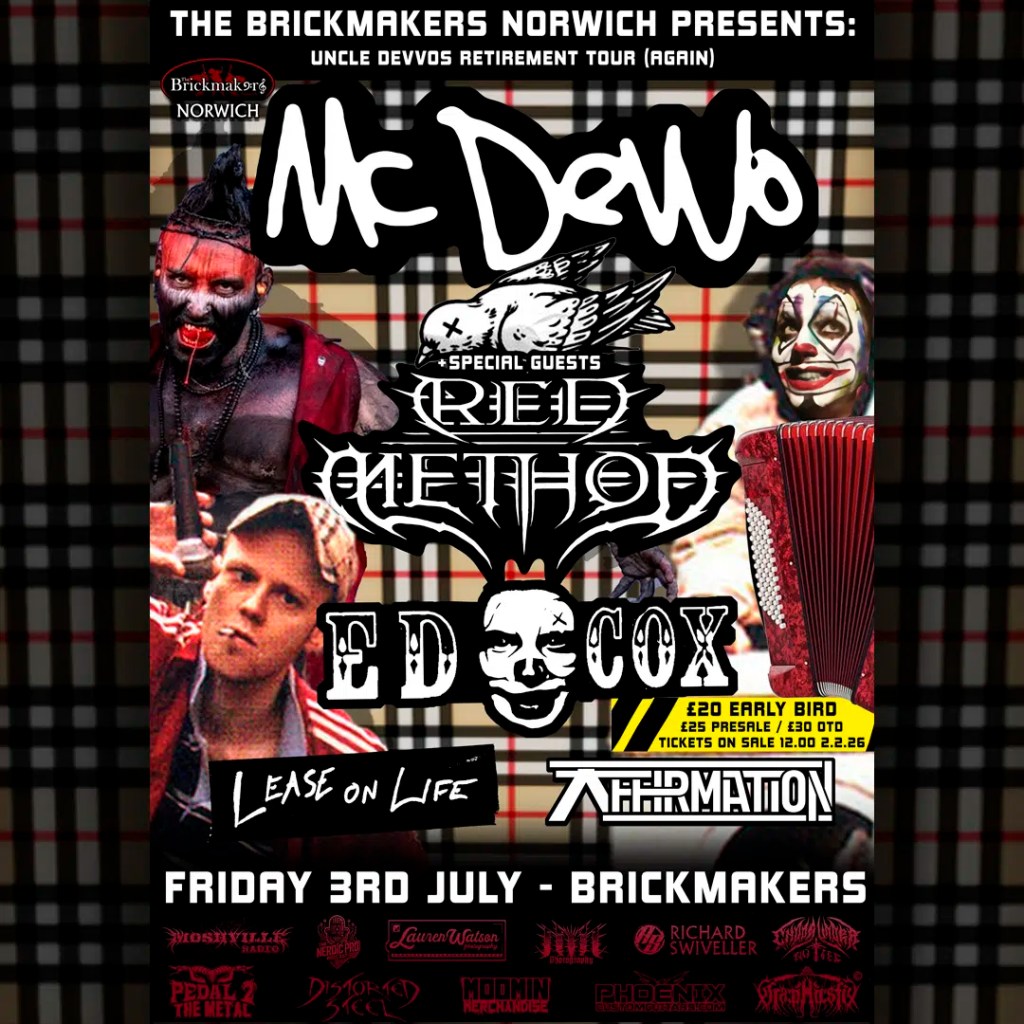 When MC Devvo last played in 2015 the venue sold out and a second date was added. There is currently only one date available for Norwich. He will be supported by Metal heavyweights Red Method first Norwich show since they sold out the B2 a few years ago. We also bring you ED COX who sold out space studios last year bringing tekno clown core rave vibes. They will be joined by local rap metal/punk legends Lease on life and Drum and Bass DJ Affirmation.