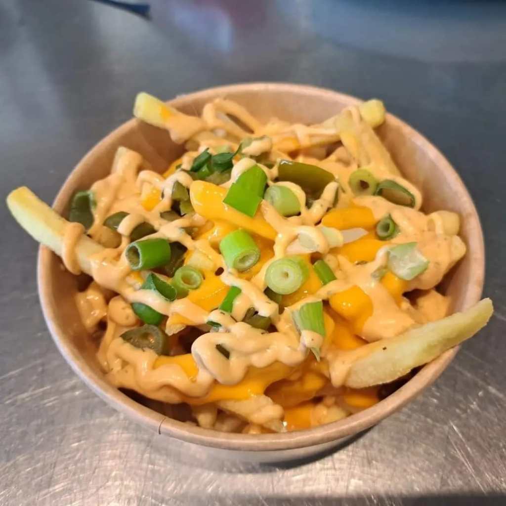 Skinny Fries topped with cheese sauce, burger sauce, spring onions and jalapenos