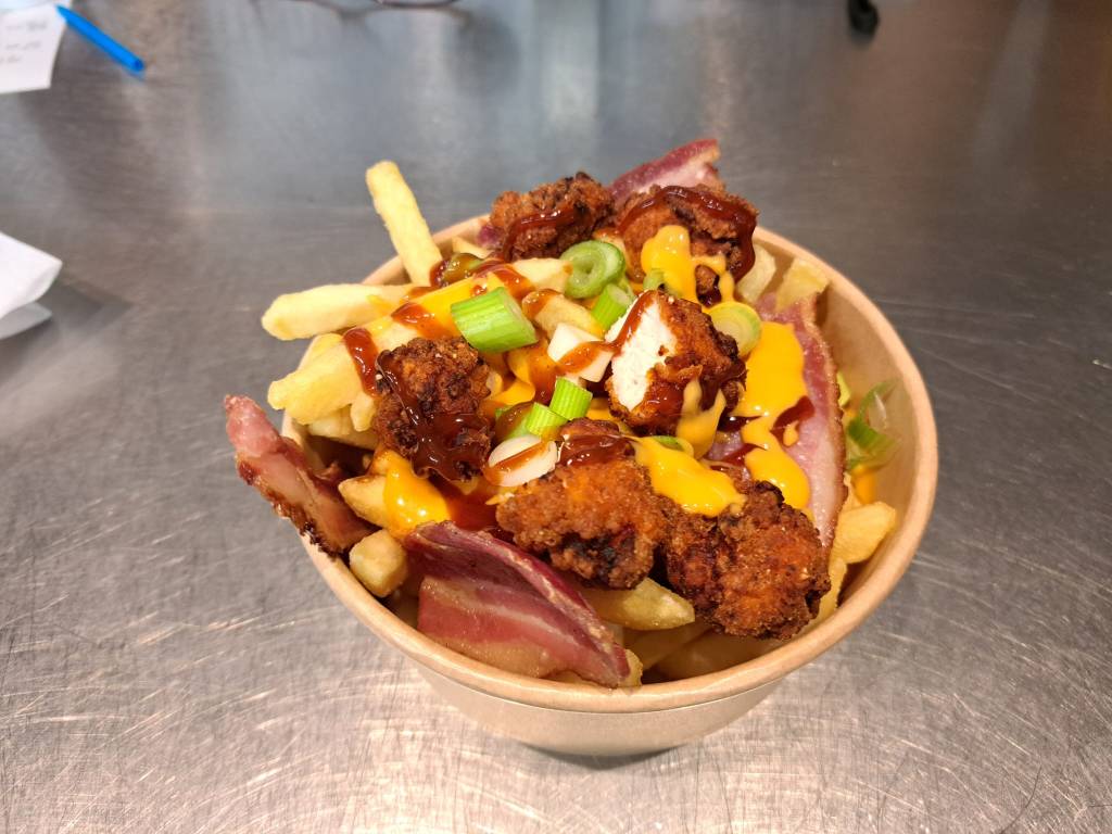 Skinny Fries topped with crispy chicken, bacon, cheese sauce, bbq sauce and spring onions