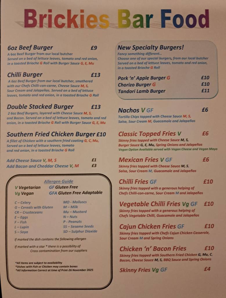 Please note, our menu can vary slightly, depending on what events we have taking place at the time.